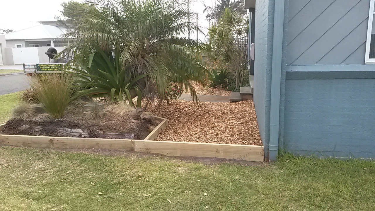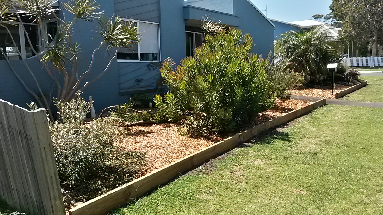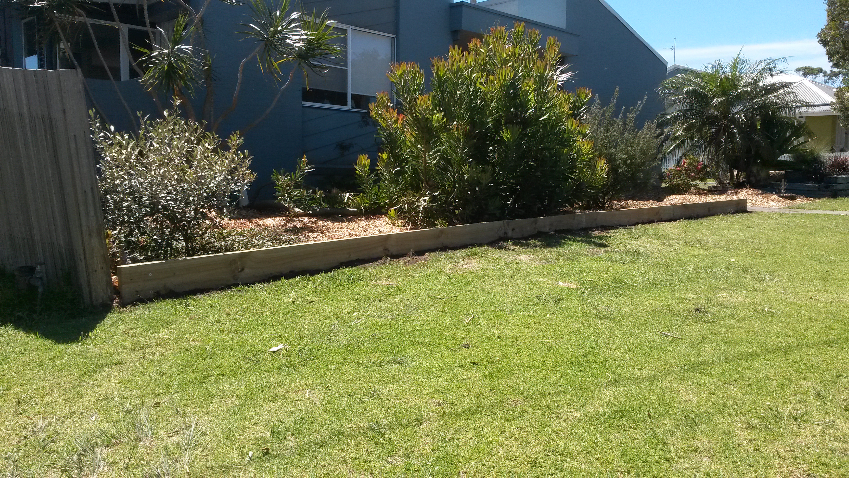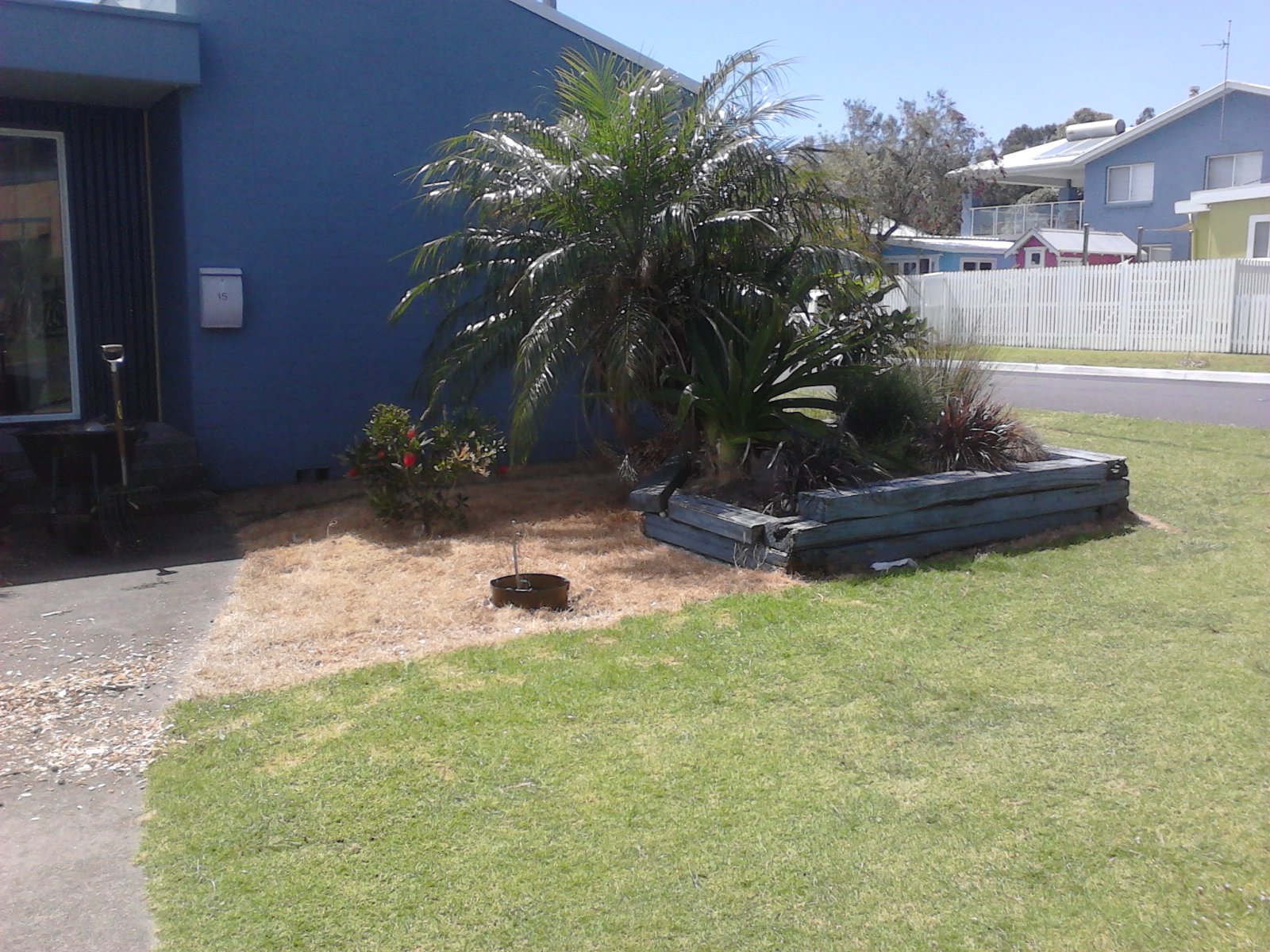 This was originally all grass; first the grass was killed, cypress mulch was put in place, then the timberwork was installed. Plants including Dietes, Dianella’s & ornamental Poa’s will be planted along the path to hold the mulch in place. Garden bed will have soil added and more plants installed….