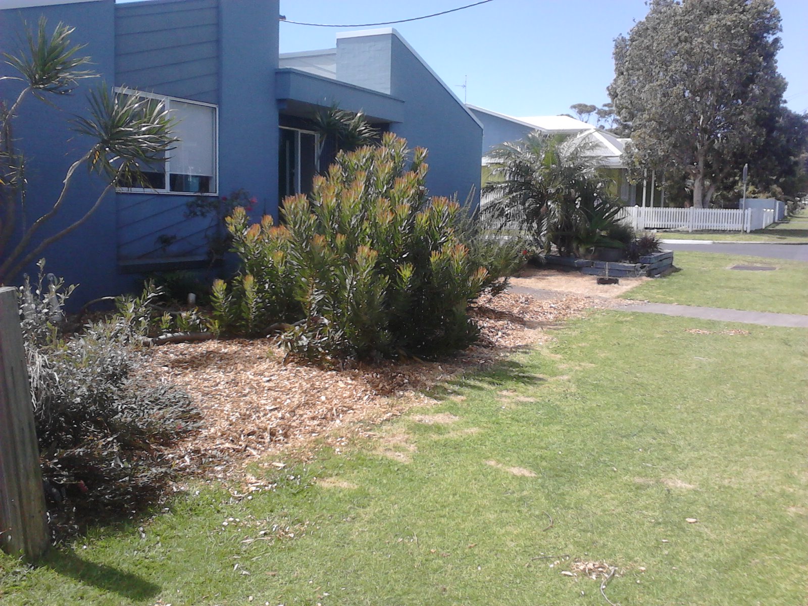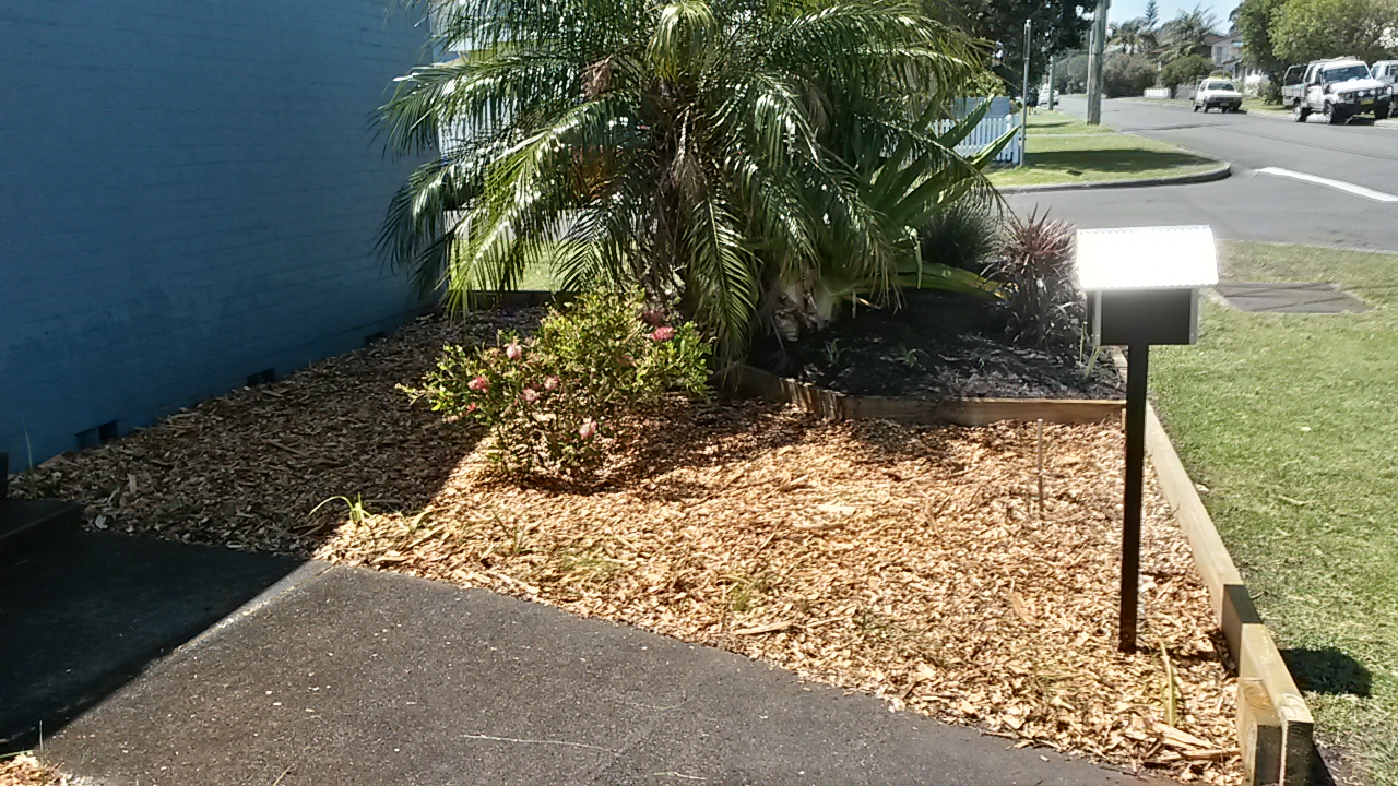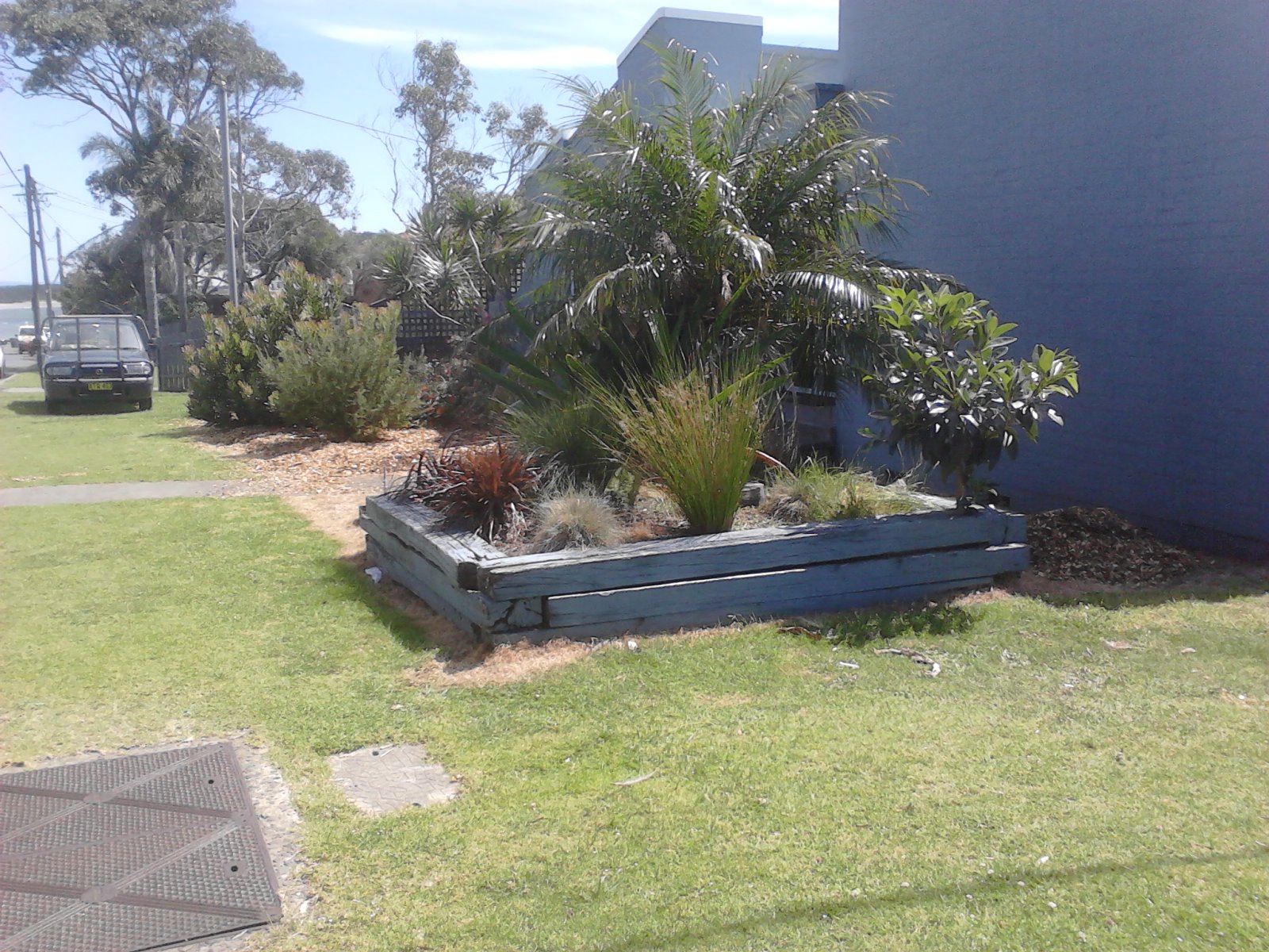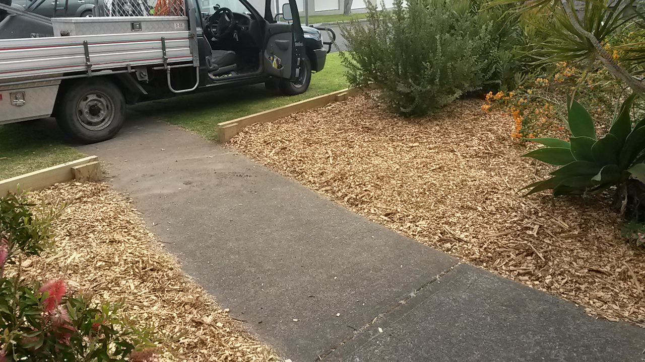 This was originally all grass; first the grass was killed, cypress mulch was put in place, then the timberwork was installed. Plants including Dietes, Dianella’s & ornamental Poa’s will be planted along the path to hold the mulch in place. Garden bed will have soil added and more plants installed….