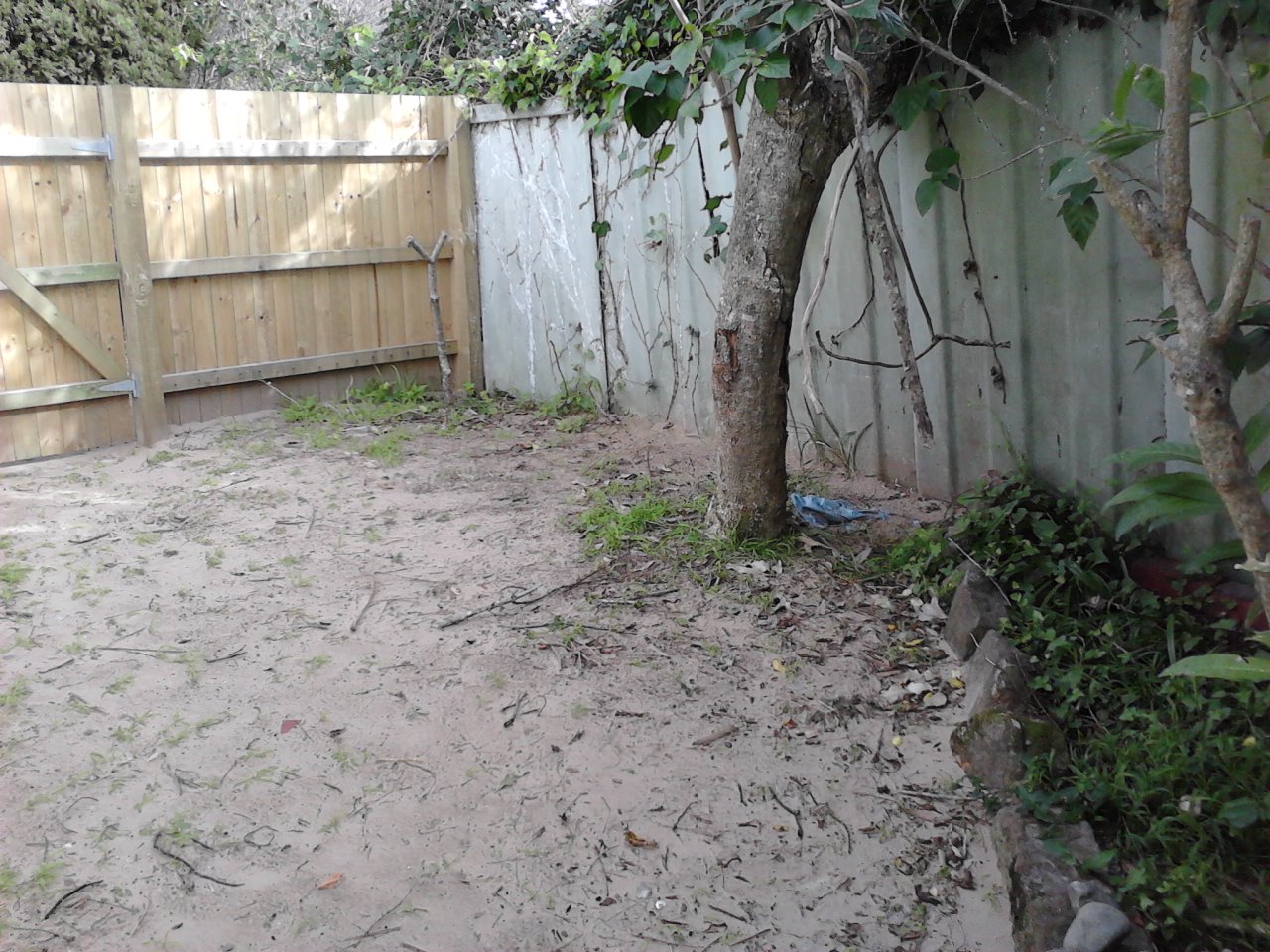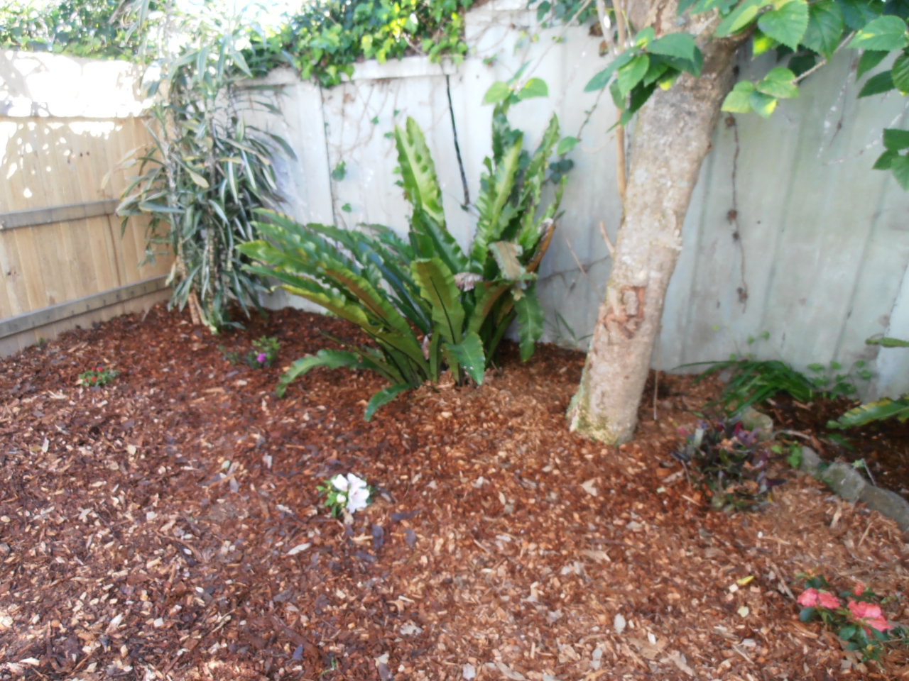 I planted 2 camellia and 3 azalea along the wall which, with a couple of years growth, will add some colour and distract from the blank wall. The side along the fence also had 3 azalea’ planted, along with a large birds nest fern and a mature dracaena in the corner; when the azalea establish and grow out, this will be a lovely setting. Another large birds nest fern was also installed in the old rockery.